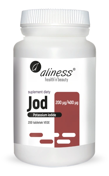 Jod (jodek potasu) 200 µg / 400 µg marki Aliness to wysokiej jakości suplement diety w formie łatwych do połknięcia tabletek VEGE, zawierający dobrze przyswajalny jodek potasu – stabilną, mineralną formę jodu. Produkt został zaprojektowany tak, aby dostarczać 200 µg jodu w porcji dziennej (½ tabletki), a jednocześnie umożliwiać elastyczne dawkowanie w zależności od potrzeb (1 tabletka = 400 µg jodu).