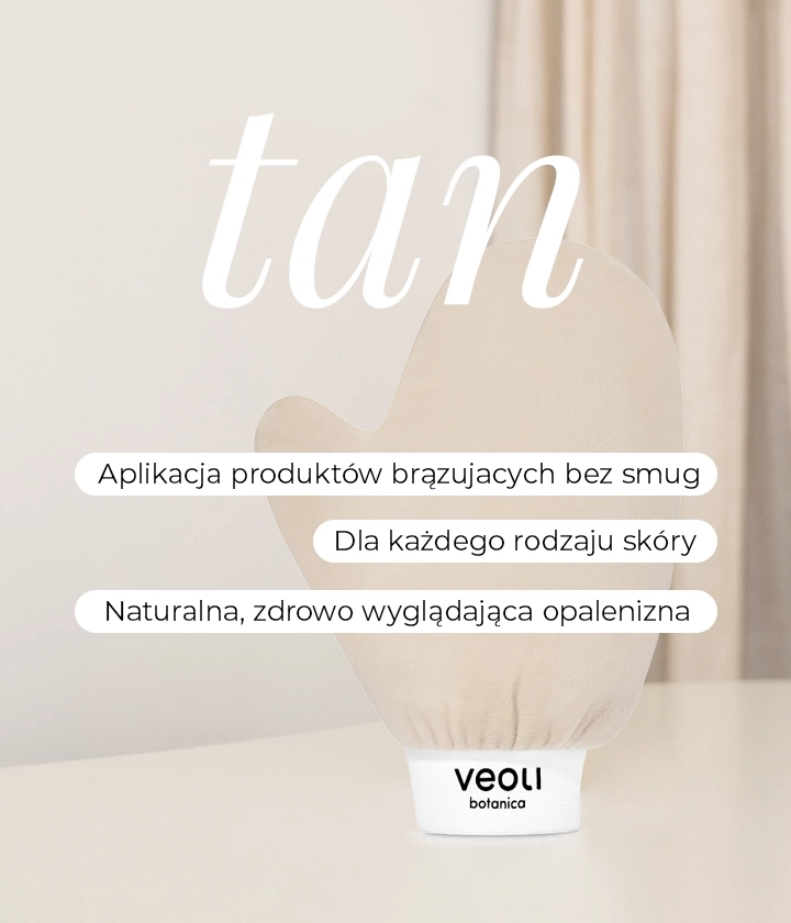 • Rękawica Veoli Botanica I glove Tan – idealna do aplikacji pianki samoopalającej, zapewnia równomierną opaleniznę bez smug i plam.