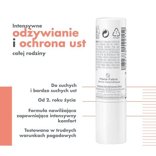 ricinus communis (castor) seed oil, bis-diglyceryl polyacyladipate-2, paraffinum liquidum (mineral oil), beeswax, butyrospermum parkii (shea) butter, ozokerite, candelilla cera, microcrystalline wax, avene thermal spring water, fragrance, tocopheryl acetate, etc. (pełny skład dostępny na opakowaniu).