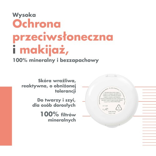 - Kompaktowy podkład przeciwsłoneczny SPF 50 w odcieniu Piaskowym chroni skórę wrażliwą przed UVA/UVB i wyrównuje koloryt, zapewniając naturalny efekt makijażu.
