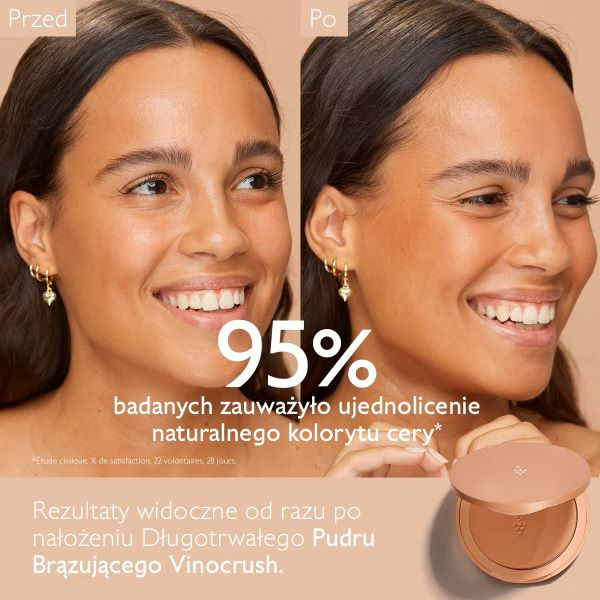 • Długotrwały Puder Brązujący Vinocrush to kosmetyk, który pozwala uzyskać efekt cery naturalnie muśniętej słońcem niezależnie od pory roku.