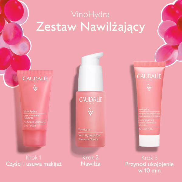 - Zestaw Caudalie VinoHydra – serum z kwasem hialuronowym, żel myjący i maska. Dogłębne nawilżenie, ukojenie i blask skóry suchej i wrażliwej. Naturalne formuły i skuteczność.
