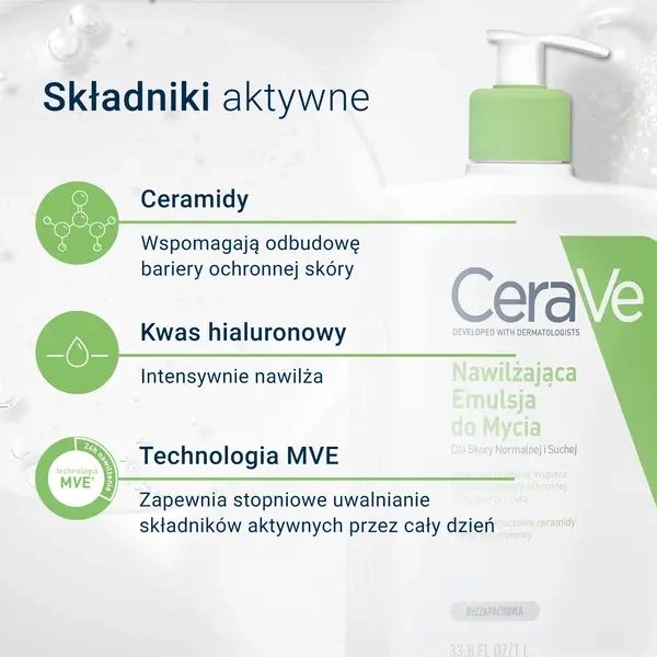 Cera Ve Nawilżająca emulsja do skóry suchej i bardzo suchej. Nawilża i wspiera odbudowę bariery ochronnej skóry twarzy i ciała. Zawiera 3 kluczowe ceramidy i kwas hialuronowy. Emulsja bezzapachowa. Hipoalergiczna.