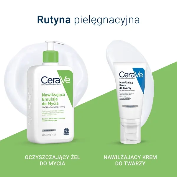 CeraVe Nawilżająca emulsja do skóry suchej i normalnej. Nawilża i wspiera odbudowę bariery ochronnej skóry twarzy i ciała. Zawiera 3 kluczowe ceramidy i kwas hialuronowy. Emulsja bezzapachowa. Hipoalergiczna. Niekomedogenna. Cera Ve Nawilżająca emulsja do skóry suchej i bardzo suchej opracowana z deramtologami, lekka emulsja o nietłustej konsystencji, zawiera 3 kluczowe ceramidy i kwas hialuronowy. Nawilża i wspiera odbudowę bariery ochronnej skóry twarzy i ciała.