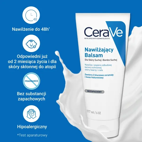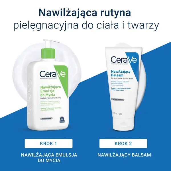 Poznaj CeraVe Nawilżający Balsam do Twarzy i Ciała dla Skóry Suchej i Bardzo Suchej, stworzony przez dermatologów, aby skutecznie odbudowywać barierę ochronną skóry. Bogata, ale nietłusta formuła dostarcza intensywnego nawilżenia nawet najbardziej wymagającej cerze. Dzięki połączeniu trzech niezbędnych ceramidów (1, 3, 6-II) i kwasu hialuronowego, balsam wspiera naturalną regenerację skóry i zatrzymuje wilgoć aż do 48 godzin.