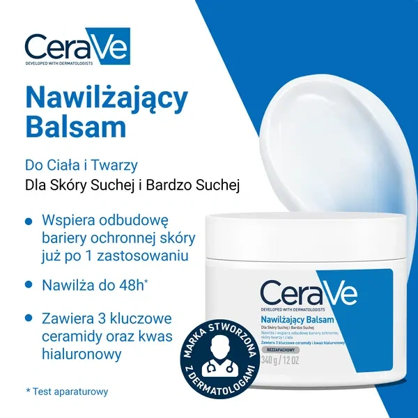 CeraVe Nawilżający Balsam to dermokosmetyk opracowany we współpracy z dermatologami, przeznaczony do codziennej pielęgnacji skóry suchej, bardzo suchej i wrażliwej. Zawiera unikalny kompleks trzech kluczowych ceramidów (1, 3, 6-II), kwas hialuronowy i technologię MVE, która stopniowo uwalnia składniki aktywne, zapewniając długotrwałe nawilżenie nawet do 24 godzin.
