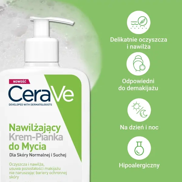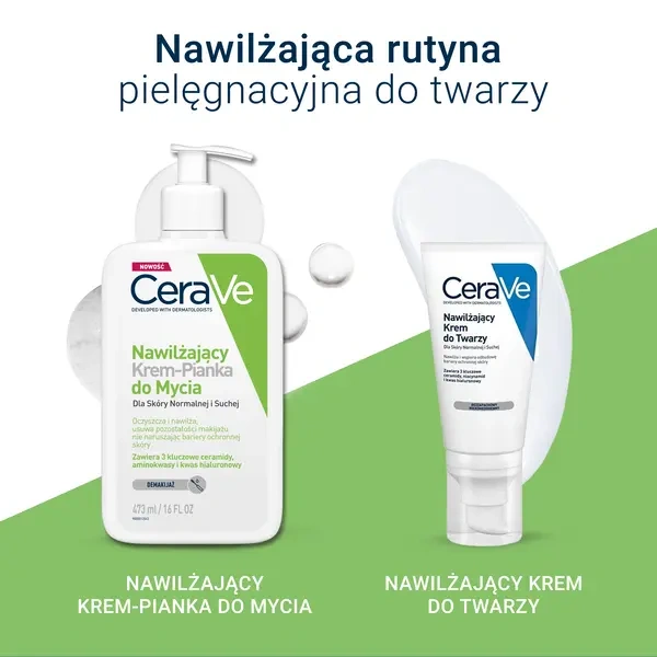 Produkty do oczyszczania twarzy mają za zadanie usuwać zanieczyszczania, sebum, kremy przeciwsłoneczne używane na codzień i makijaż. Ważne jest, aby wybrać formułę, która odpowiada potrzebom poszczególnych typów skóry, nie zaburzając ich naturalnej bariery ochronnej. Osoby o suchej skórze mogą korzystać z zalet zarówno z kremowej konsystencji produktu do mycia, który nawilża, jak i pianki, która zapewnia uczucie odświeżenia skóry — bez konieczności dokonywania wyboru pomiędzy nimi. Opracowany przy współpracy z dermatologami CeraVe Nawilżający krem-pianka do mycia, ma postać kremu, a następnie przekształca się w delikatną piankę, po spienieniu go na skórze z wodą. Skutecznie usuwa zanieczyszczenia i makijaż, nie pozbawiając skóry naturalnego nawilżenia i nie pozostawiając skóry napiętej ani suchej. Ta delikatna, bezzapachowa formuła zawiera trzy kluczowe ceramidy, aminokwasy i kwas hialuronowy, które współpracują ze sobą, aby regenerowac barierę ochronną skóry i zapewniać nawilżenie.