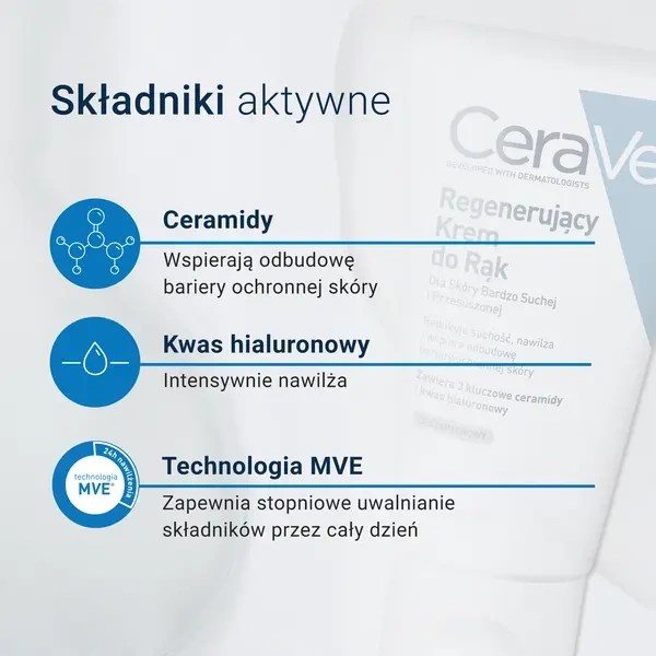 - Cera Ve Regenerujący krem do rąk dla skóry bardzo suchej i przesuszonej. Redukuje suchość, nawilża i wspiera odbudowę bariery ochronnej skóry twarzy i ciała. Zawiera 3 kluczowe ceramidy i kwas hialuronowy. Bezzapachowy.