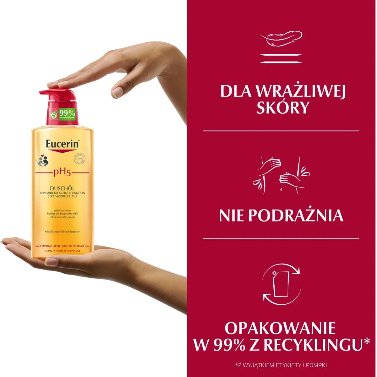 • Eucerin pH5 Olejek do Mycia to łagodny preparat do codziennej higieny ciała, stworzony specjalnie dla skóry suchej, wrażliwej i skłonnej do podrażnień.