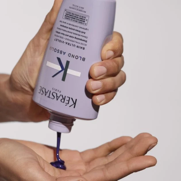 Kérastase Blond Absolu Bain Ultra-Violet 250 ml to profesjonalny szampon stworzony dla osób z włosami blond, rozjaśnianymi i siwymi, które wymagają neutralizacji niepożądanych żółtych i miedzianych refleksów. Dzięki zawartości fioletowych pigmentów, szampon skutecznie odświeża kolor, przywraca chłodny odcień włosów i podkreśla ich blask. Formuła została wzbogacona o kwas hialuronowy i ekstrakt z szarotki alpejskiej, które intensywnie nawilżają i wzmacniają strukturę włosa, chroniąc przed łamliwością i przesuszeniem. Regularne stosowanie Kérastase Blond Absolu Bain Ultra-Violet sprawia, że włosy stają się miękkie, gładkie i promienne.