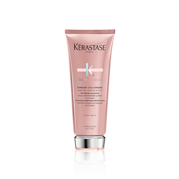 Odżywka Kérastase Chroma Absolu Fondant Cica Chroma 200 ml została stworzona dla osób z włosami koloryzowanymi, osłabionymi, zwiększonym ryzykiem łamliwości oraz o cienkiej lub średniej gęstości struktury. Formuła Kérastase Chroma Absolu Fondant Cica Chroma 200 ml odpowiada na potrzeby włosów poddanych zabiegowi koloryzacji — które wymagają nie tylko wygładzenia i odżywienia, ale także ochrony koloru i redukcji porowatości.