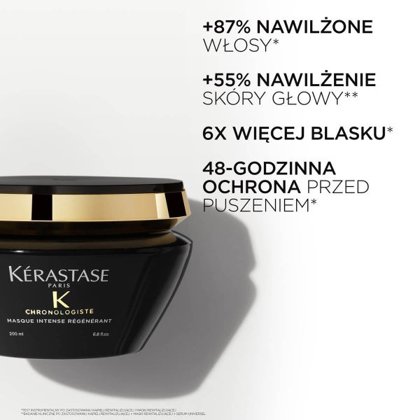 Formuła maski została wzbogacona o kwas hialuronowy, witaminę E i ekstrakt z kawioru, które wspólnie przywracają włosom witalność, elastyczność i gładkość. Kérastase Chronologiste skutecznie wygładza włosy, przeciwdziała ich puszeniu oraz chroni przed oznakami starzenia. Idealna do każdego rodzaju włosów, szczególnie tych osłabionych, suchych i pozbawionych blasku.