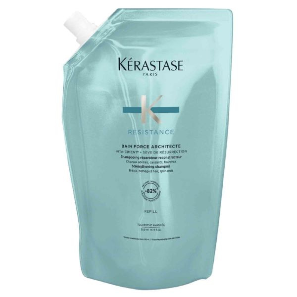 Regeneracja od podstaw dla włosów, które straciły siłę i elastyczność. Kérastase Résistance Bain Force Architecte REFILL 500 ml to ekonomiczne i ekologiczne opakowanie uzupełniające kultowego szamponu wzmacniającego zniszczone, łamliwe i osłabione włosy. Doskonały wybór dla codziennej pielęgnacji włosów wymagających odbudowy po stylizacji termicznej, farbowaniu lub intensywnych zabiegach chemicznych.