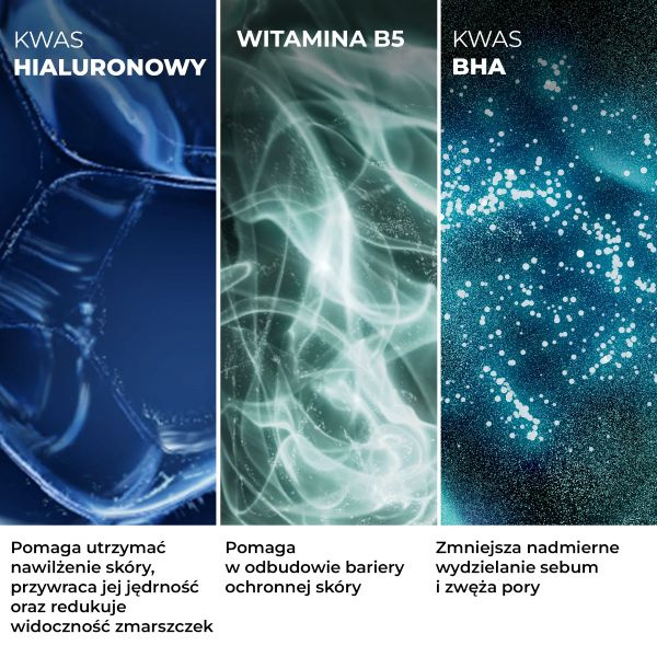 - Lekki krem-żel z kwasem hialuronowym, witaminą B5 i kwasem salicylowym, który nawilża, regeneruje i matuje skórę tłustą i mieszaną.
