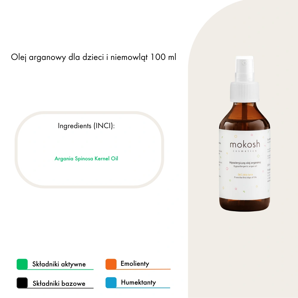 • MOKOSH Olej Arganowy to wyjątkowy kosmetyk przeznaczony do pielęgnacji delikatnej skóry dzieci i niemowląt. Dzięki naturalnej, organicznej formule intensywnie nawilża, odżywia oraz chroni przed podrażnieniami i czynnikami zewnętrznymi.
