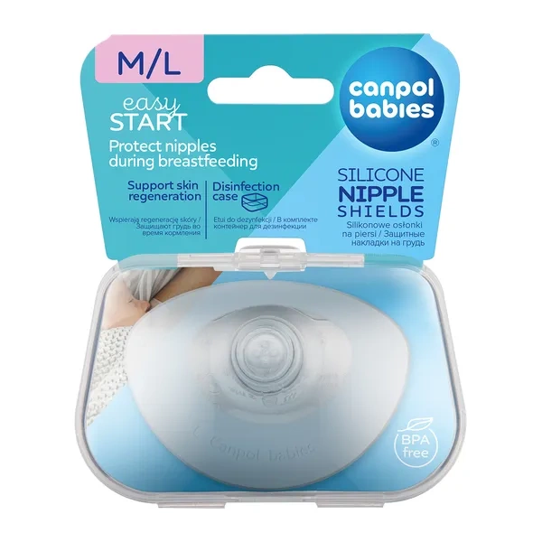 Osłonki na piersi wykonane z miękkiego i delikatnego silikonu umożliwiają bezbolesne karmienie. Doskonale chronią obolałe i popękane brodawki oraz przyspieszają gojenie ran. Górna nieco węższa krawędź osłonki sprawia, że dziecko jedząc, może przytulić się do piersi matki, poczuć zapach jej skóry i ciepło. Silikon nie posiada zapachu ani smaku, dlatego nie wpływa na smak pokarmu. Specjalnie etui do sterylizacji ułatwia higienę i utrzymanie osłonek w czystości. Umożliwia szybką, 2-minutową dezynfekcję w kuchence mikrofalowej. W opakowaniu 2 sztuki.