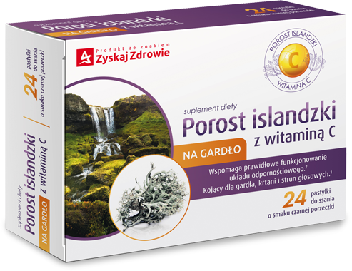 Zyskaj Zdrowie Porost islandzki z Witaminą C – Pastylki na Gardło, Wsparcie Odporności, 24 sztuki