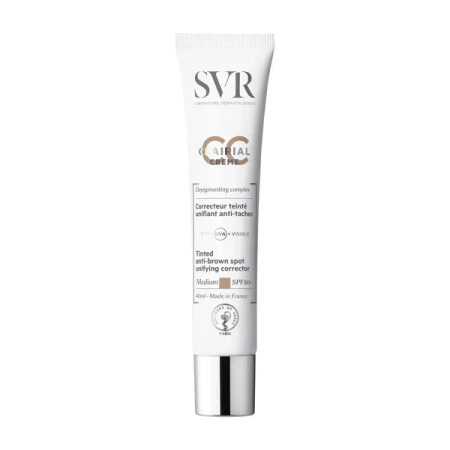 SVR Clairial Crème CC Medium SPF50+, 40 ml, to innowacyjny dermokosmetyk, który łączy właściwości korektora kolorytu z ochroną przeciwsłoneczną i pielęgnacją skóry z przebarwieniami. Dzięki technologii Clairial™ oraz pigmentom CC, krem natychmiast wyrównuje koloryt cery, maskuje niedoskonałości i przeciwdziała powstawaniu nowych plam pigmentacyjnych.