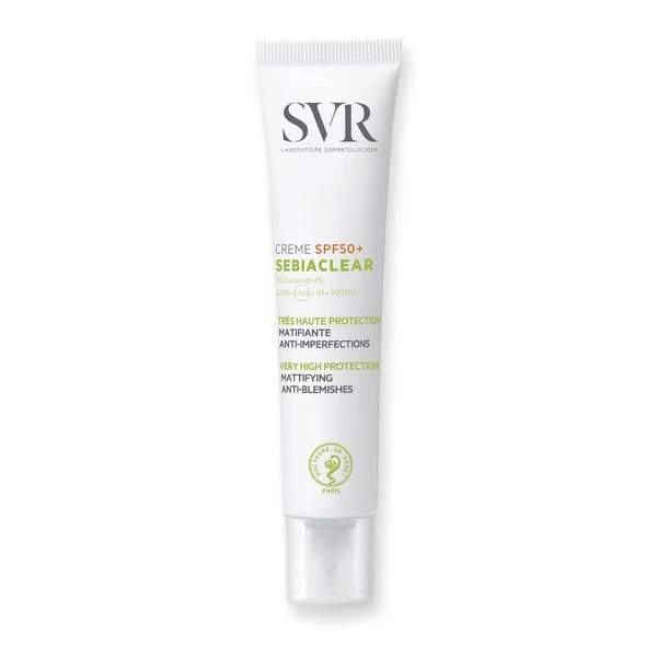 SVR Sebiaclear Krem Matujący do Skóry Trądzikowej SPF50+, 40ml to dermatologiczny krem stworzony specjalnie z myślą o skórze tłustej, mieszanej i skłonnej do trądziku. Zapewnia bardzo wysoką ochronę przeciwsłoneczną (SPF50+) i jednocześnie reguluje nadmiar sebum, redukuje niedoskonałości oraz działa matująco przez cały dzień.