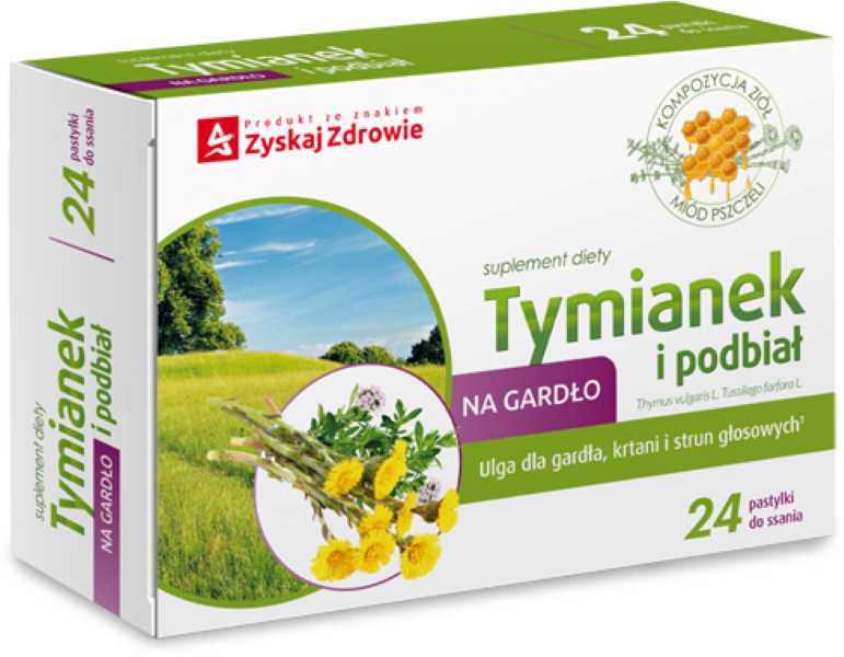 - Zyskaj Zdrowie Tymianek i Podbiał to pastylki do ssania zawierające ekstrakty roślinne wspierające zdrowie gardła, krtani oraz strun głosowych.