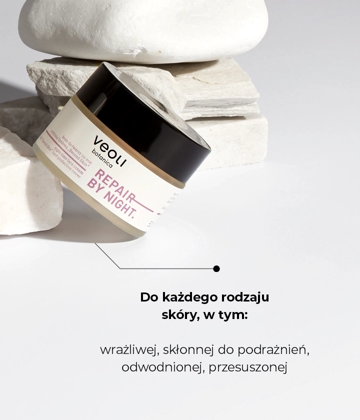 Formuła kremu Veoli Repair By Night wspiera nocne procesy odnowy biologicznej, kiedy skóra intensywnie się regeneruje. Po przebudzeniu jest ona wyraźnie gładsza, promienna i bardziej wypoczęta. Krem idealnie sprawdza się w pielęgnacji każdego typu cery, szczególnie suchej, zmęczonej i odwodnionej.