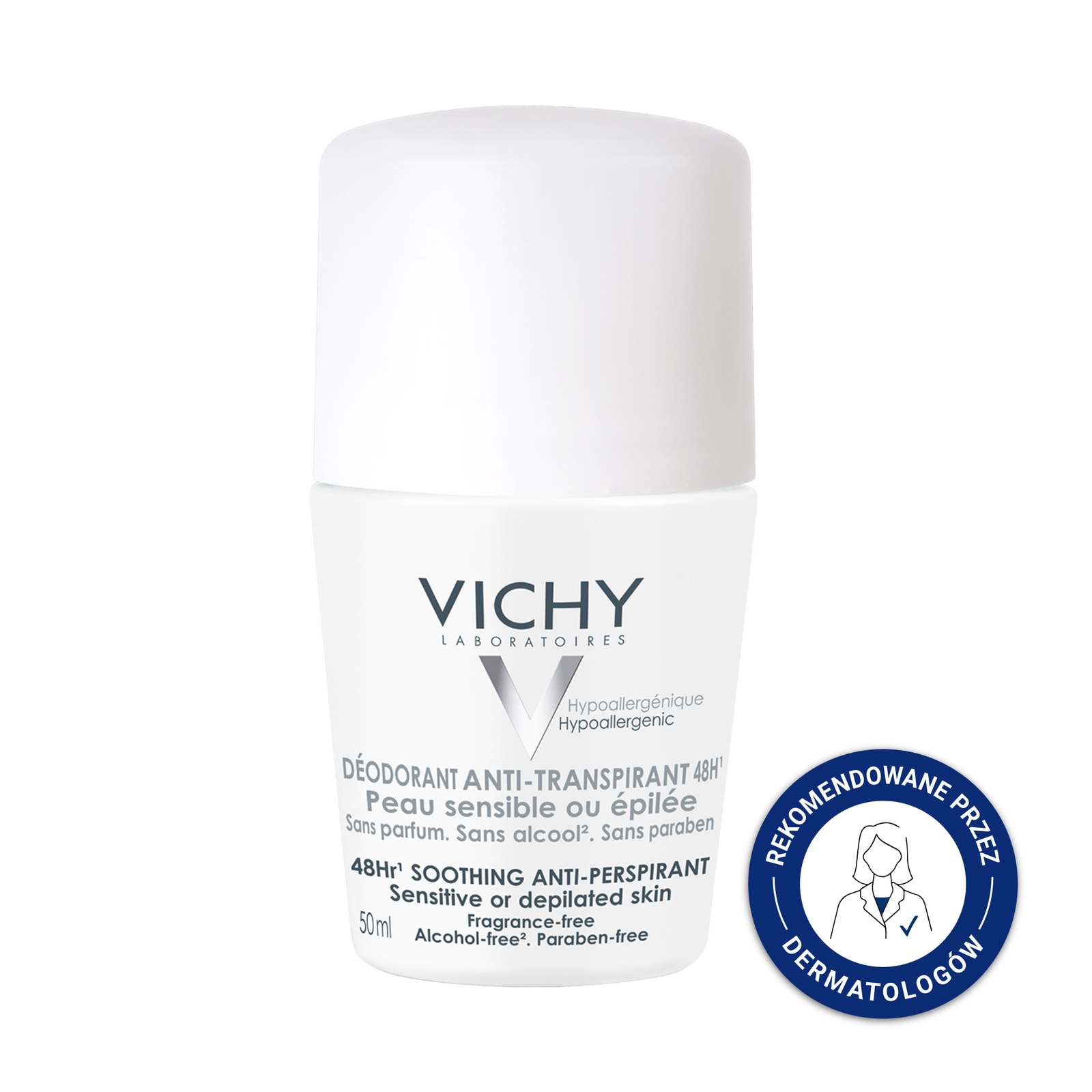 Vichy Antyperspirant Kojący 48h to delikatny, a jednocześnie skuteczny antyperspirant w kulce, opracowany specjalnie dla osób z wrażliwą, podrażnioną lub depilowaną skórą pach. Dzięki zawartości alantoiny i formule bez alkoholu etylowego, działa kojąco, łagodząco i chroni skórę przed zaczerwienieniem.
