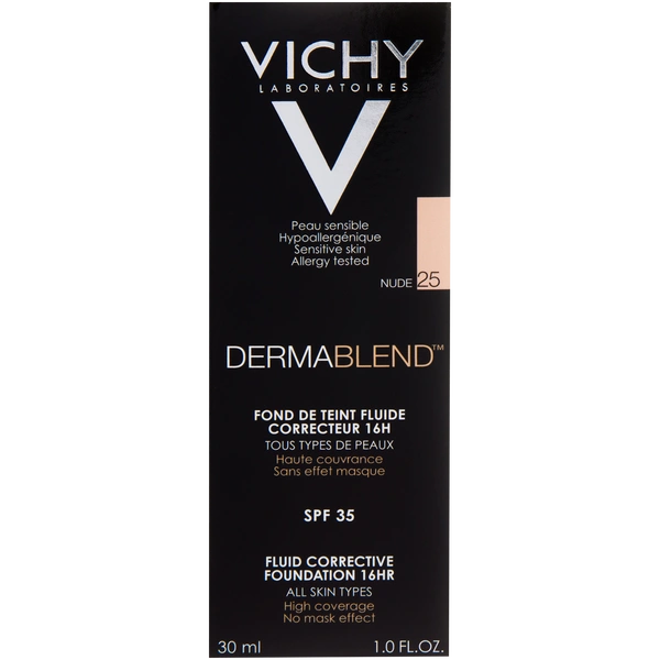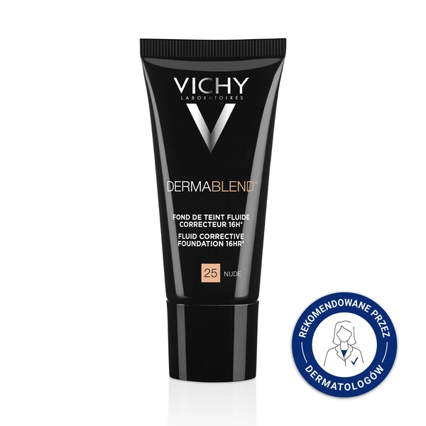 • Fluid korygujący Vichy Dermablend 25 Nude zapewnia pełne krycie, wyrównuje koloryt skóry, nawilża i chroni filtrem SPF 35.