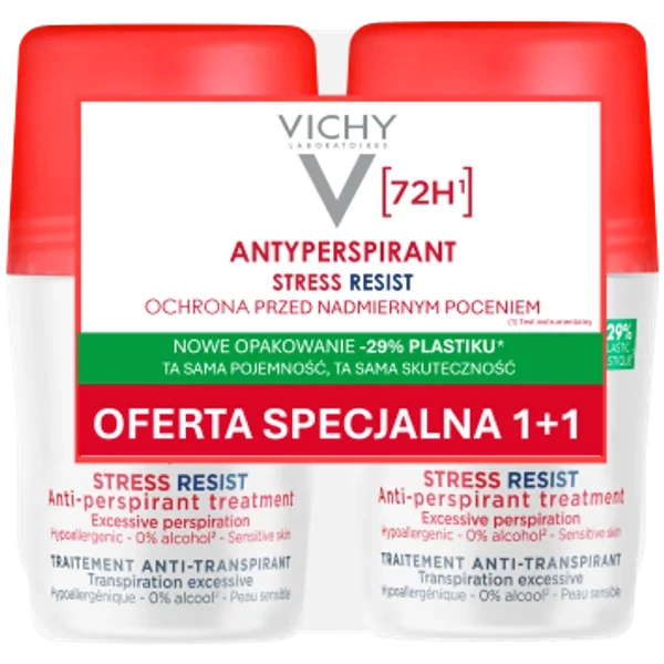 - Antyperspirant Vichy dla kobiet redukujący potliwość stresową, zapewniający do 48 h ochrony i wysoką tolerancję dla skóry.
