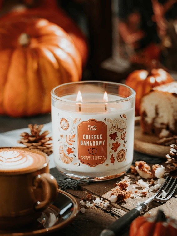 - W&K Świeca sojowa Chlebek Bananowy 350g – słodki zapach świeżo upieczonego chlebka bananowego z nutą wanilii i cynamonu. Naturalna, ręcznie robiona świeca sojowa o długim czasie palenia.