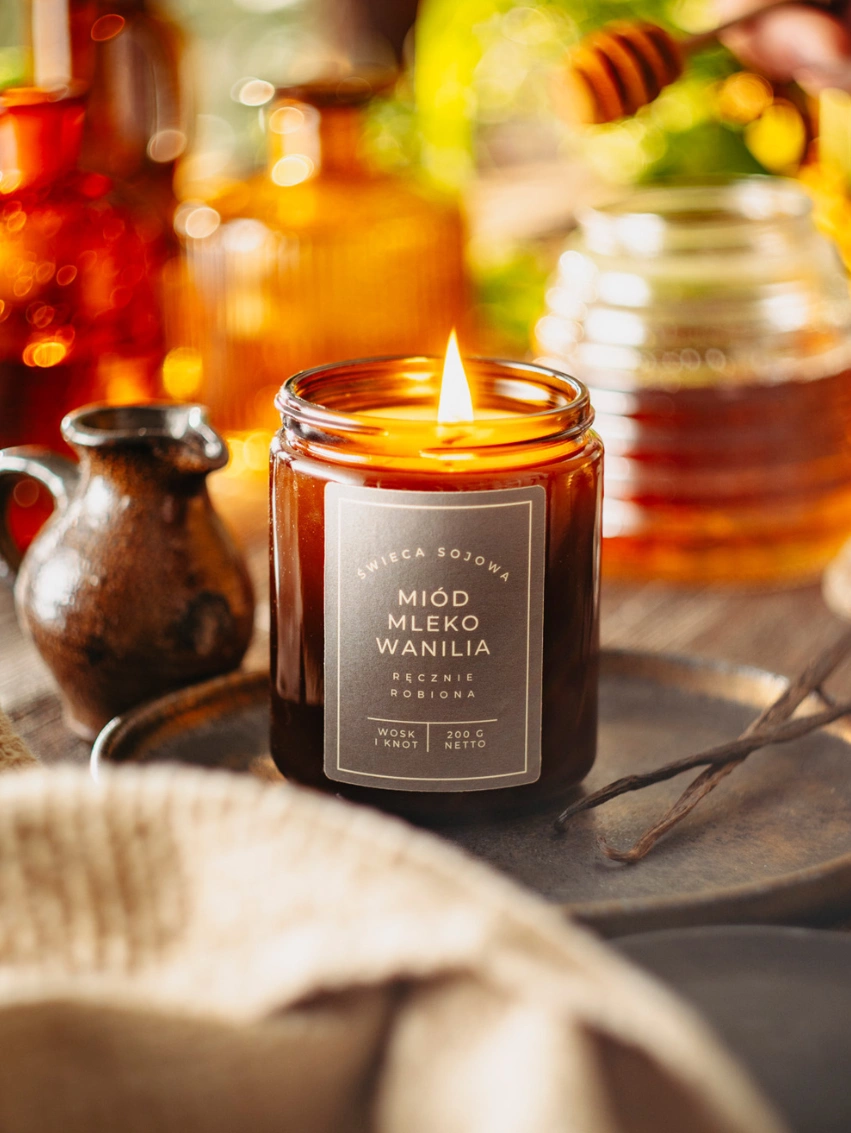 - W&K Świeca sojowa Miód, Mleko & Wanilia 200g – naturalna, ręcznie robiona świeca o kremowym zapachu miodu, mleka i wanilii. Ciepła, słodka i relaksująca kompozycja zapachowa idealna na każdą porę roku.