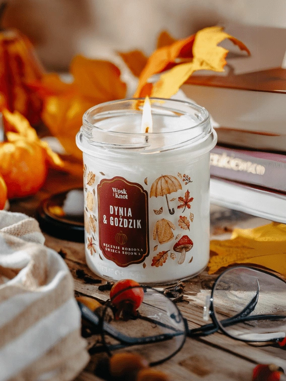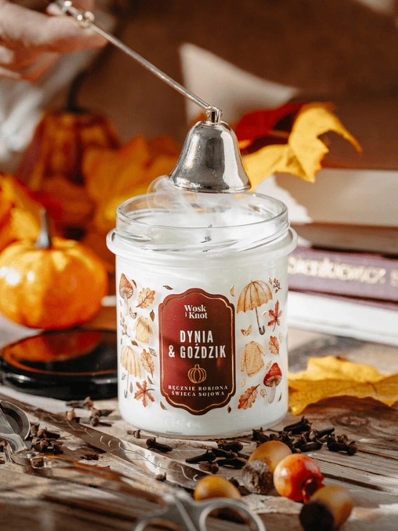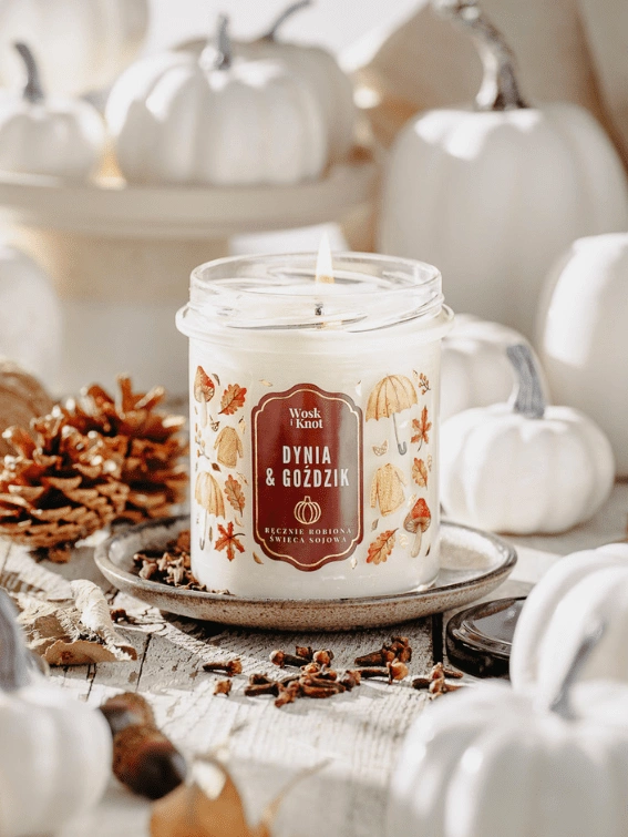 - Naturalna świeca sojowa o zapachu dyni i goździków, która wypełnia wnętrze ciepłym, korzennym aromatem jesieni.