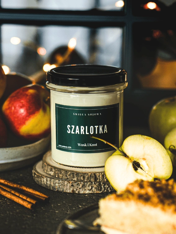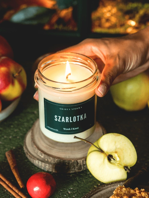 - Naturalna świeca sojowa o zapachu domowej szarlotki z jabłkami i cynamonem, która wypełnia wnętrze ciepłym, korzennym aromatem.