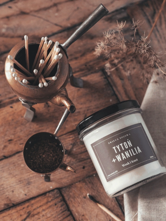 - Naturalna świeca sojowa o eleganckim zapachu tytoniu i wanilii, która łączy intensywność z ciepłą słodyczą.